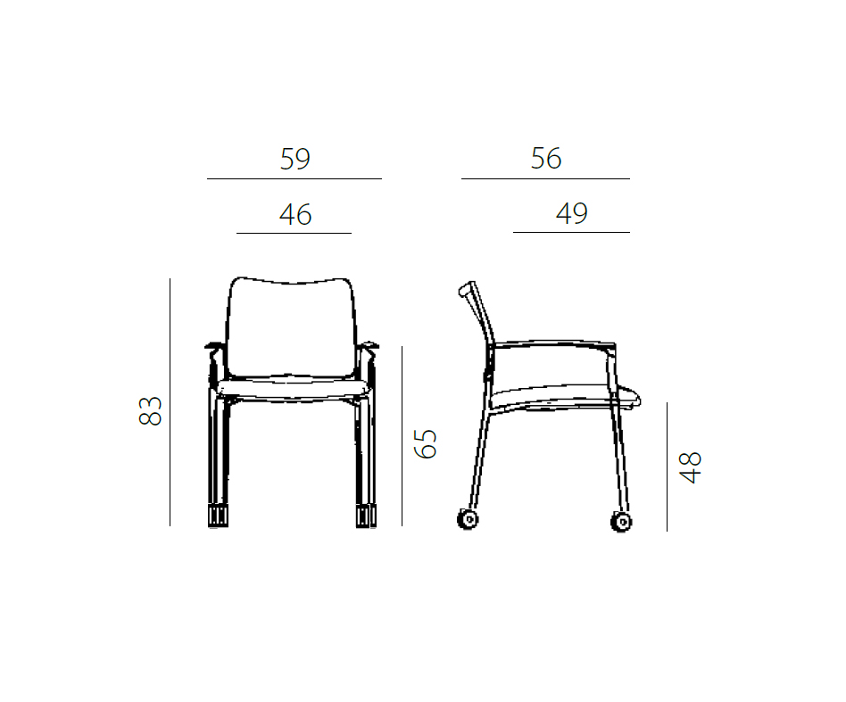 Upholstered seat and backrest. Tubular steel legs with a diameter of Ø 25x2 mm, with castors, available in black epoxy varnish or chrome-plated finish. Polyamide armrest. Optional hook-up system included. Pallet-stacked and wrapped in stretch foil. Includes a 3-year warranty. Loading capacity 120 kg.
